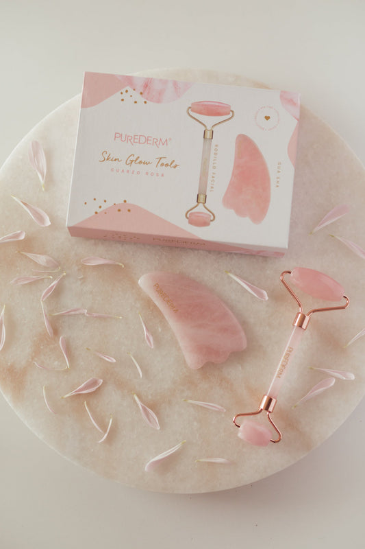Rodillo facial y GuaSha de Cuarzo Rosa